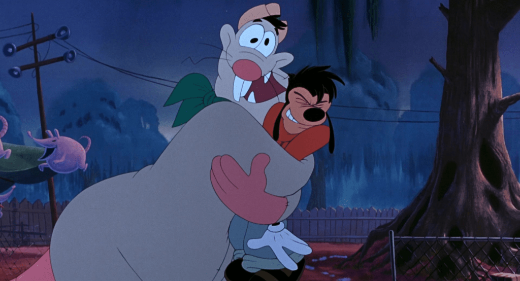 Auf ihrer Reise besuchen sie den heruntergekommenen Themenpark „Lester’s Possum Park“, wo Goofy Max unfreiwillig blamiert. Beim Camping treffen sie auf K.J. und dessen Vater Kater Karlo. Als Goofy seinem Sohn die „Perfekte Wurf“-Angeltechnik beibringt, locken sie versehentlich Bigfoot an und müssen die Nacht im Auto verbringen. Während Goofy schläft, ändert Max heimlich die Route auf der Karte nach Los Angeles.