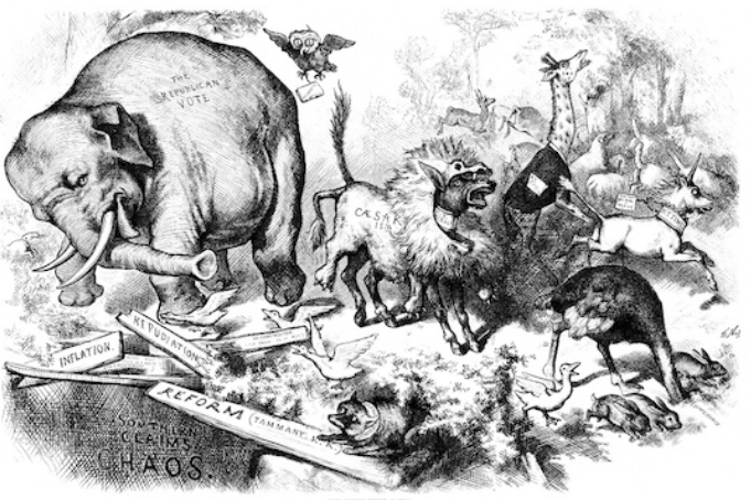 Thomas Nast verwendete beide Tiere in seinen politischen Cartoons für „Harper’s Weekly“ immer wieder als bildliche Verkörperungen der beiden großen Parteien. So etablierten sie sich als deren traditionelle Symbole.