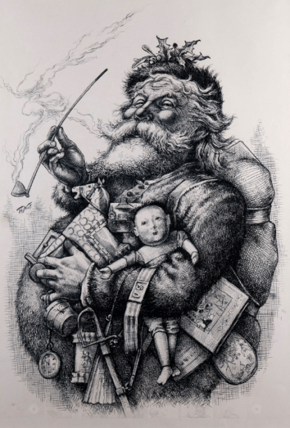 Thomas Nast prägte zudem das moderne Bild des Weihnachtsmannes. Er zeichnete ihn als freundlichen, dicken Mann mit weißem Bart und rotem Anzug – inspiriert von der deutschen Legende des Sankt Nikolaus, der am 6. Dezember Geschenke an Kinder verteilt. Nast zeigte den Weihnachtsmann in verschiedenen Situationen: beim Besuch der Soldaten im Bürgerkrieg oder beim Überprüfen seiner Liste der braven und unartigen Kinder. Seine Darstellung beeinflusste die Kultur weltweit. Der Weihnachtsmann wurde zum Symbol der Freude, des Friedens und der Großzügigkeit. Nast verband ihn auch mit dem Nordpol, den Rentieren und dem Schlitten. Andere Künstler und Medien übernahmen seine Bilder, die sich schnell verbreiteten. So trug er dazu bei, dass der Weihnachtsmann zur festen Tradition wurde – eine Tradition, die bis heute anhält.