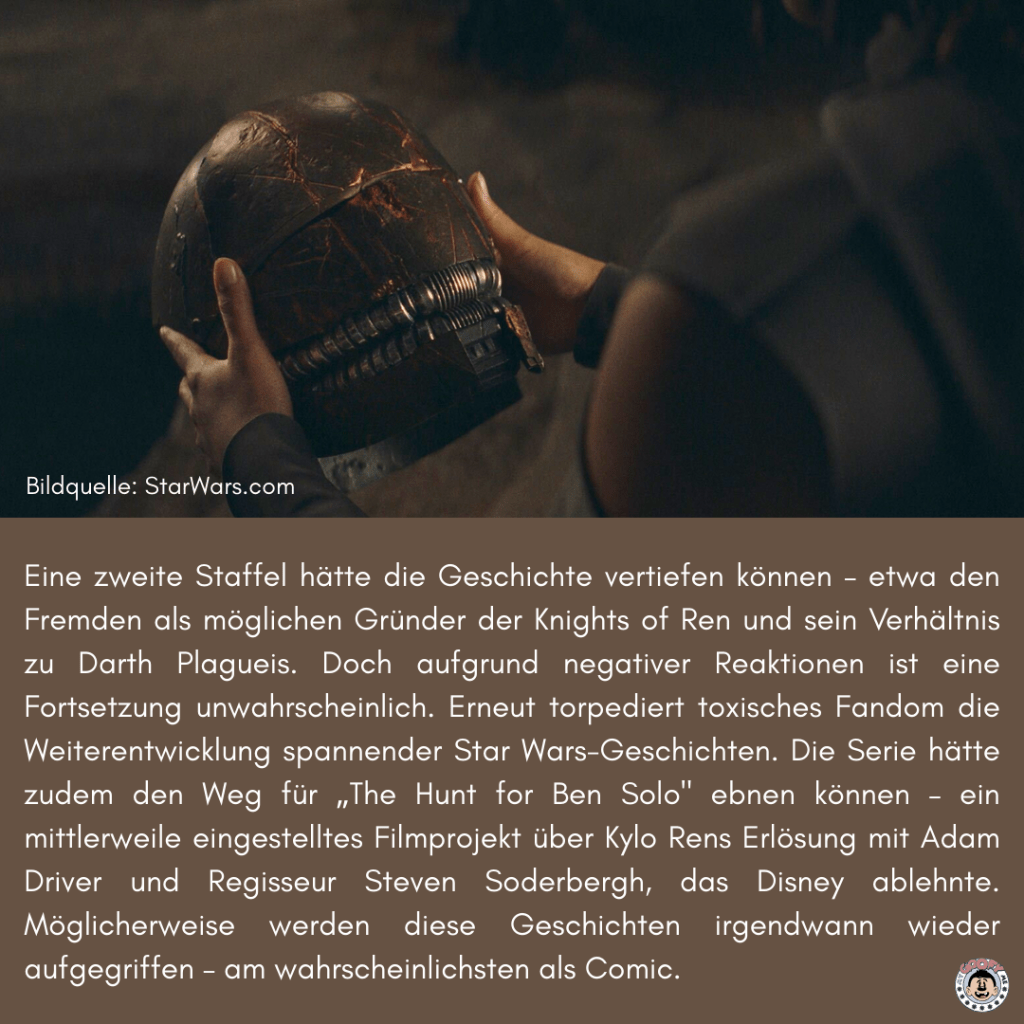 Ob es sich dabei um Zufälle, Animationsfehler oder doch um Spuren eines verworfenen Plans handelt, muss letztlich jede Person für sich selbst entscheiden. Faszinierend ist dieses Gedankenspiel allemal. Und es führt zu einer bitteren Frage: Welche Geschichten und Twists sind uns vielleicht entgangen, weil toxische Reaktionen im Fandom kreative Entscheidungen schon im Ansatz erstickt haben? Ein weiteres Beispiel ist die Serie „The Acolyte“, die wegen toxischer Downvotes voraussichtlich nicht fortgesetzt wird, obwohl sie vielversprechende Handlungsstränge andeutete. Am Ende tauchte Darth Plagueis nur kurz auf – die Geschichte um seine Beobachtung des Fremden wäre vermutlich weiter erzählt worden. Zudem deutete die Serie an, dass der Fremde der erste Träger des Namens Ren gewesen sein könnte.